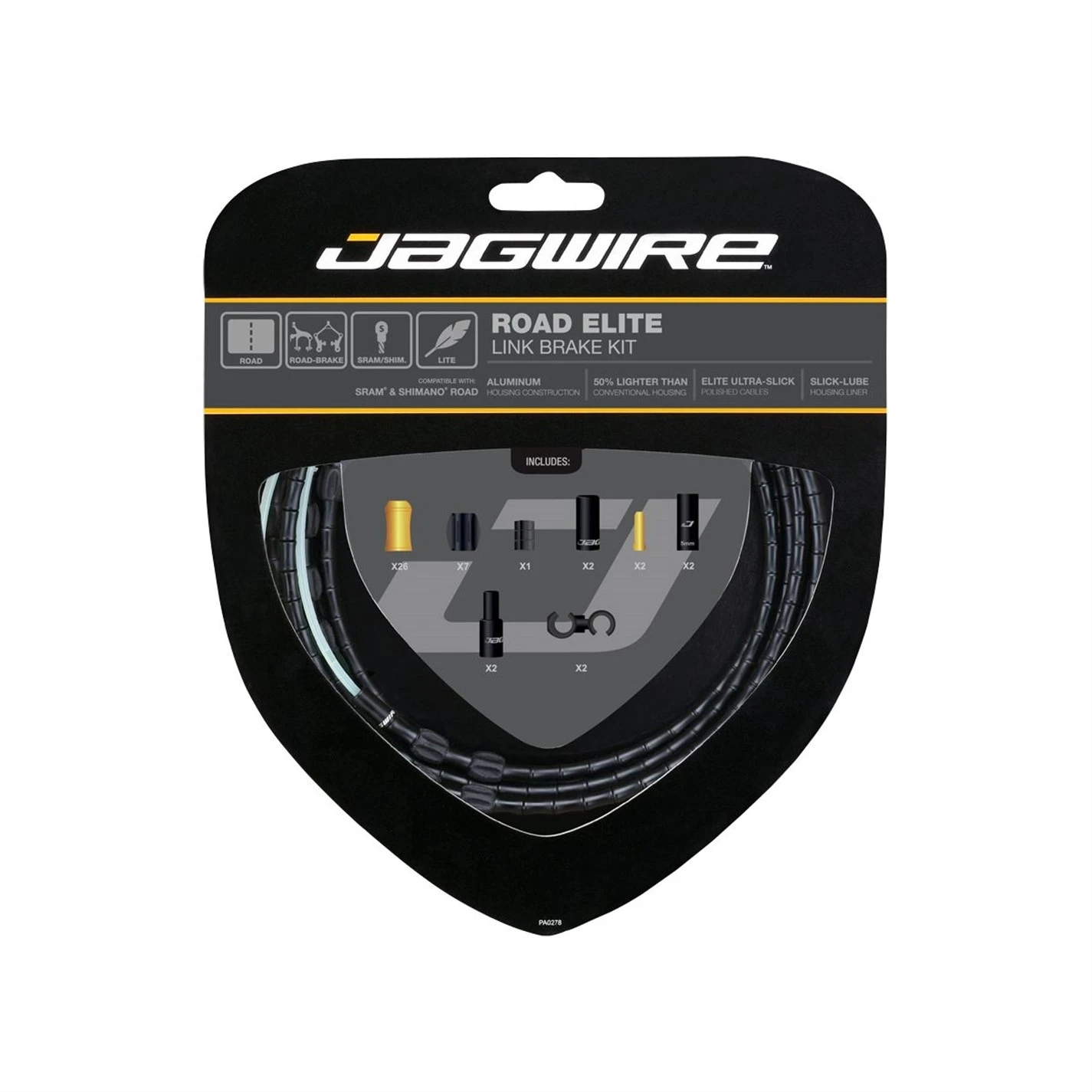 Jagwire Elite Link Brake Kits are the ultimate combination of durability and attention-grabbing looks. Available in six eye- catching colors and for road or mountain bikes, they improve any bike’s performance and appearance. The Elite Link housing uses a series of aluminum links to provide a compressionless system for better braking performance with enhanced modulation. But unlike other compressionless housing, its fLEXibility allows for tight bends without kinking. It’s also much lighter than traditional housing while being more durable. Combine these benefits with Elite, ultra-slick polished cables and Slick-Lube liners, and you’ve got the best of performance and style. Precise, compressionless braking performance combined with extreme fLEXibility. Each kit comes with links pre-installed on housing segments making setup quick and simple. 50 weight savings compared to traditional brake housing. Durable, ultra-slick polished inner cables minimize system friction.