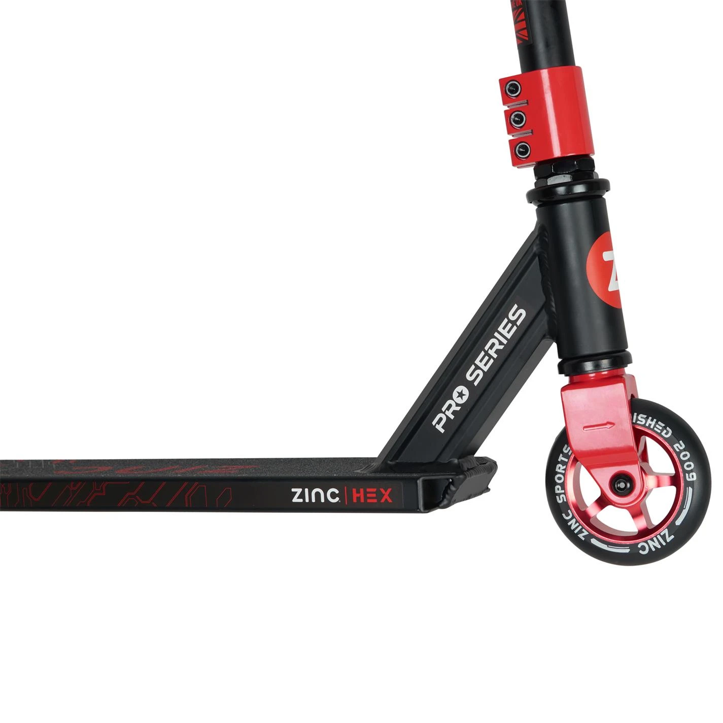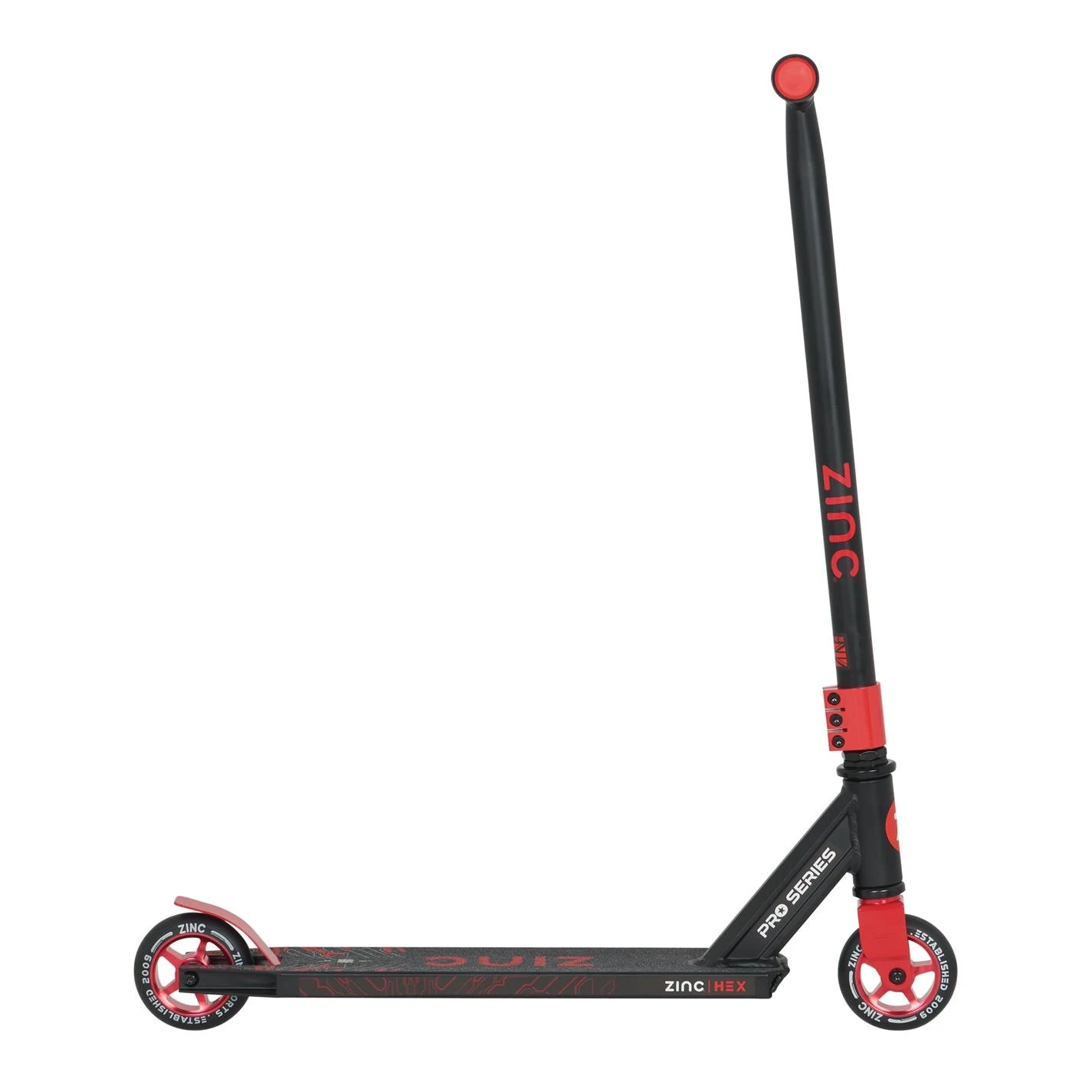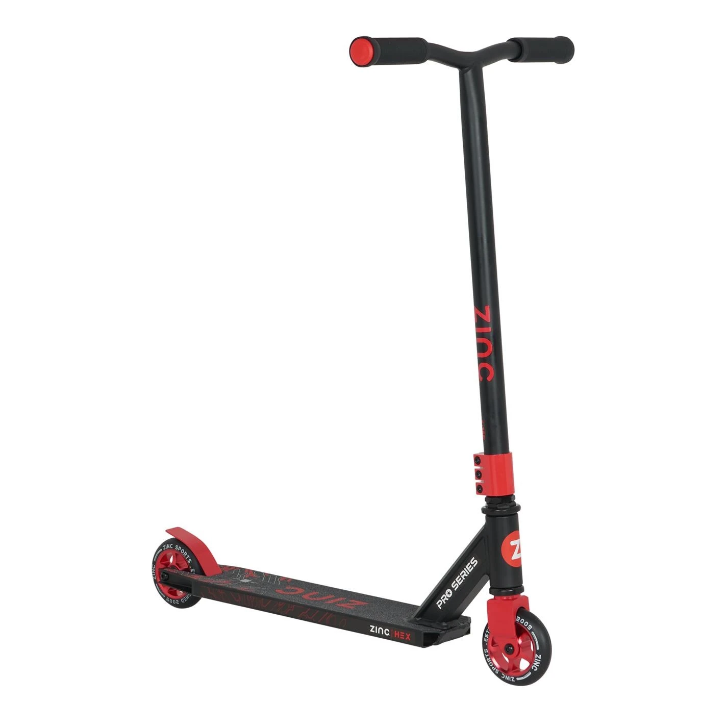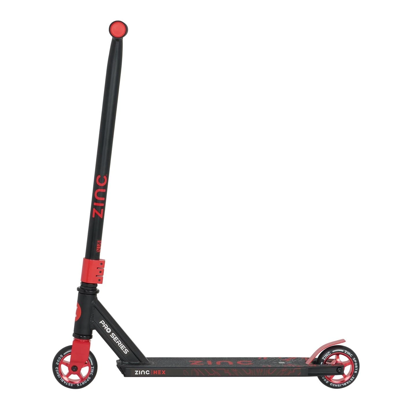 he Hex comes with a 46.5cm wide pro style handlebar and a solid triple clamp for extra strength and durability. You can practice and show off your epic skills to your friends and family with the 360-degree rotating deck and handlebar. Equipped with highly durable 100mm PU alloy core wheels and high-quality precision made ABEC 7 bearings, your rides will always be smooth, bump free and fast. Your safety is important to us at Zinc, that’s why the Hex comes with a rear footbrake to bring you safely to a stop as well as an anti-slip footplate to prevent any falls whilst you are mastering and showing off your skills. Made with a lightweight aluminium frame, the Hex is a light 3.4kg so that you can carry your scooter around easily and always be ready to have fun!