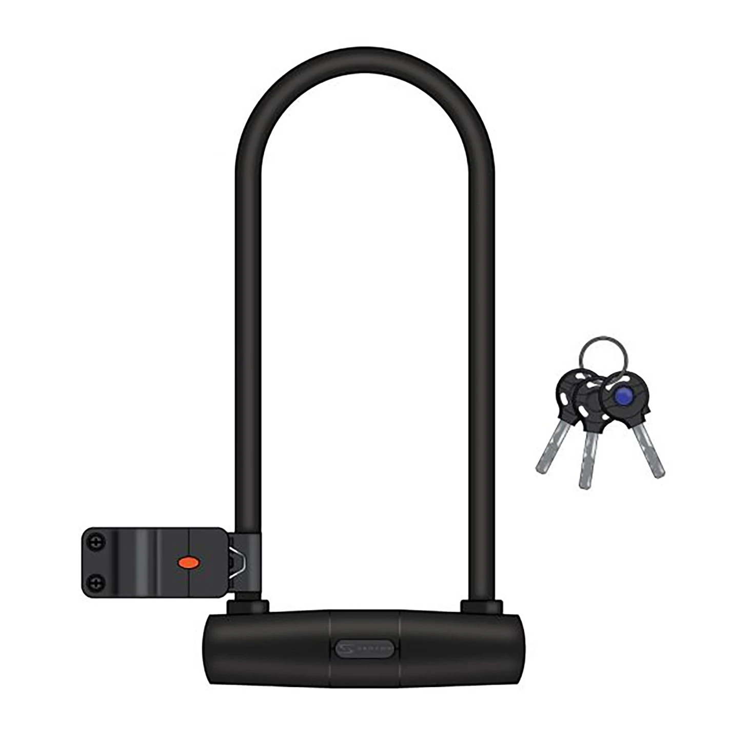 Features: Includes 3 Keys (1 With LED Light & 2 Standard) Solid Hardened Steel U-Lock With Double Dead Bolt Locking Mechanism For Extra Resistance &Â Holding Strength Dust Cover To Keep Locking Cylinder Clean Rubber Coated Durable Finish Frame Mount With Quick Release 6Ft Vinyl Coated 10mm Thick Braided Steel Cable Specs: Shackle Length: 290mm (11.42 inches) Shackle Diameter: 15mm (0.6 inches) Weight: 1,723 Grams (3.8 lbs) Key Type: Internal Cut Cable: 6ft Length (183 cm) 10mm Thick (0.39 inch) Vinyl Coated Braided Steel Security Rating: 7/10