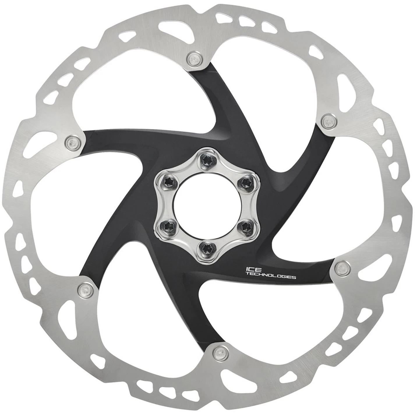 Shimano RT86 XT Ice-Tec 6-Bolt Disc Rotors are made from a stainless steel/alloy 3-layer sandwich construction that manages heat while riding. The clad steel/alloy/steel rotor construction allows heat generated from braking to radiate quickly through the aluminium core achieving surface temperature drops of around 50 deg C. When used with Ice-Tec pads surface temperatures can drop from around 400 to 300 deg C, this provides great improvements in performance all round. Ice-Tec rotors achieve long pad life, less noise and less fade due to improved heat dispersion.