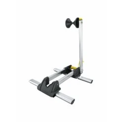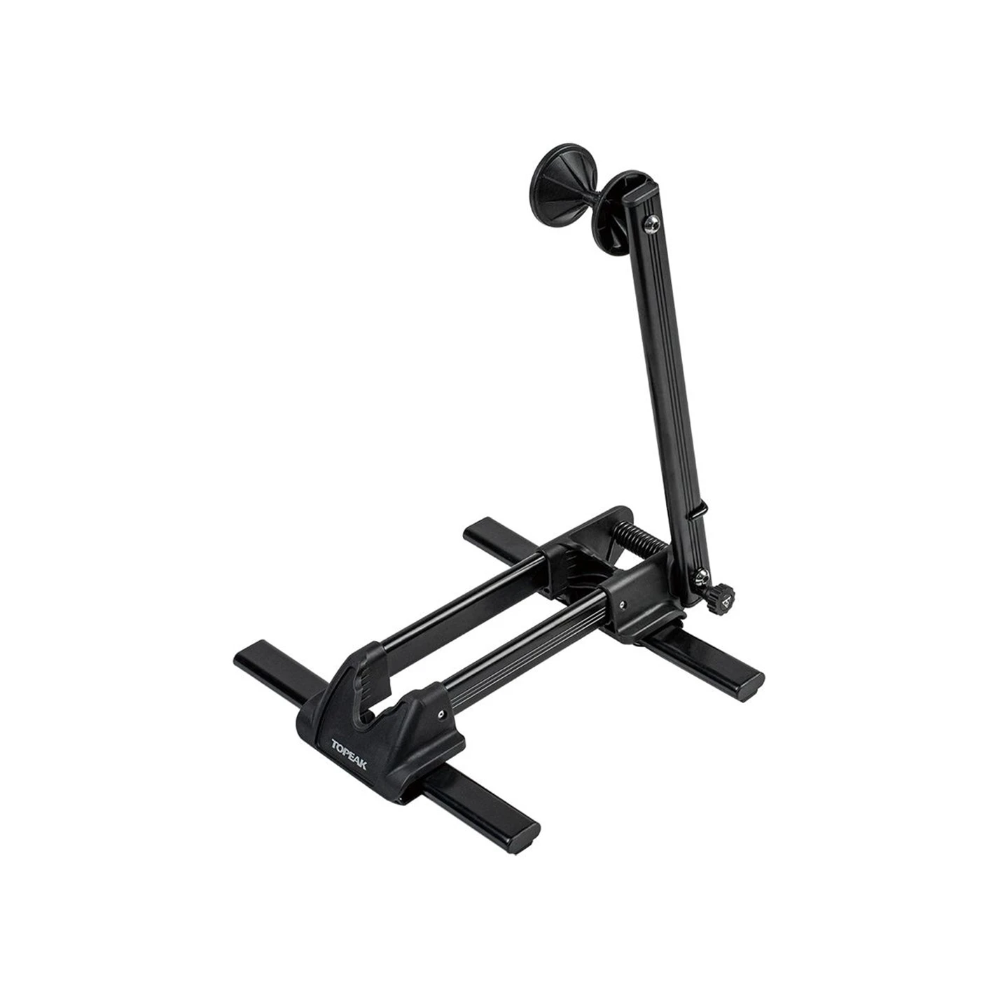 Compact, folding stand for storing or displaying bikes. A spring loaded arm holds front or rear wheel securely.