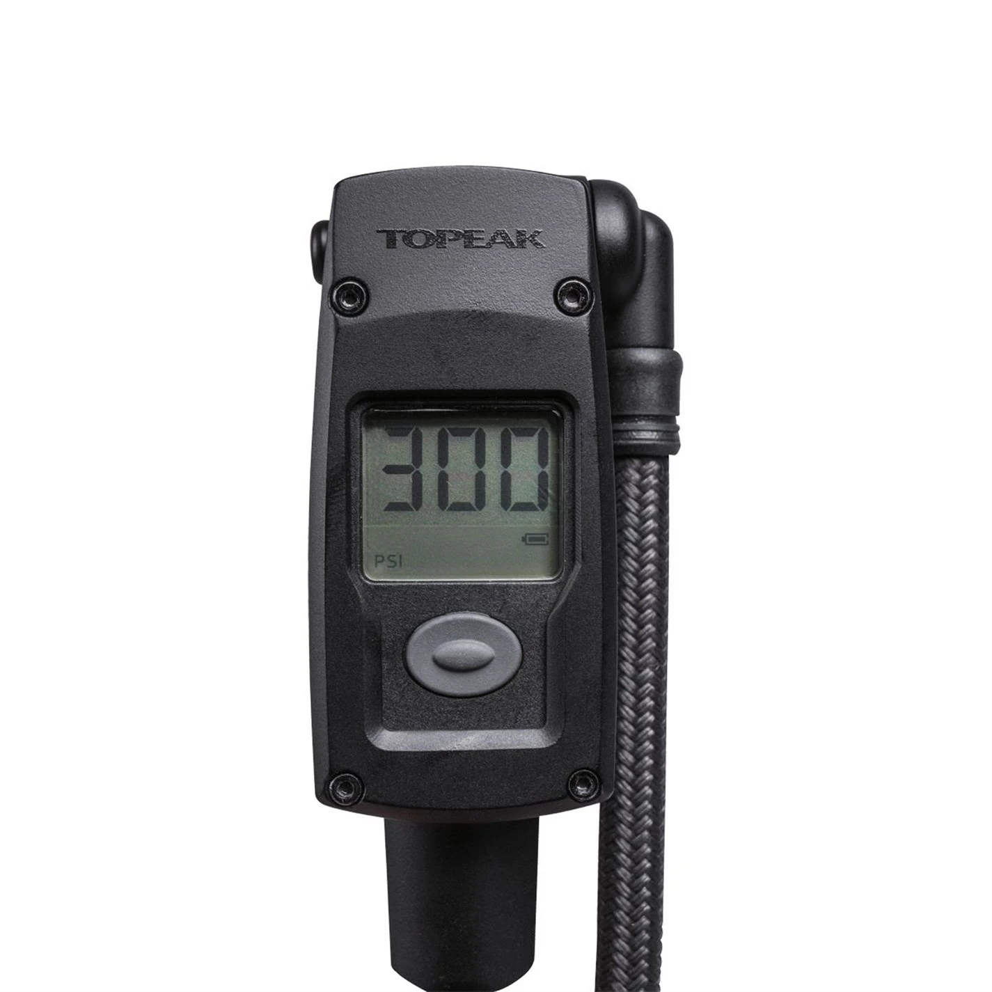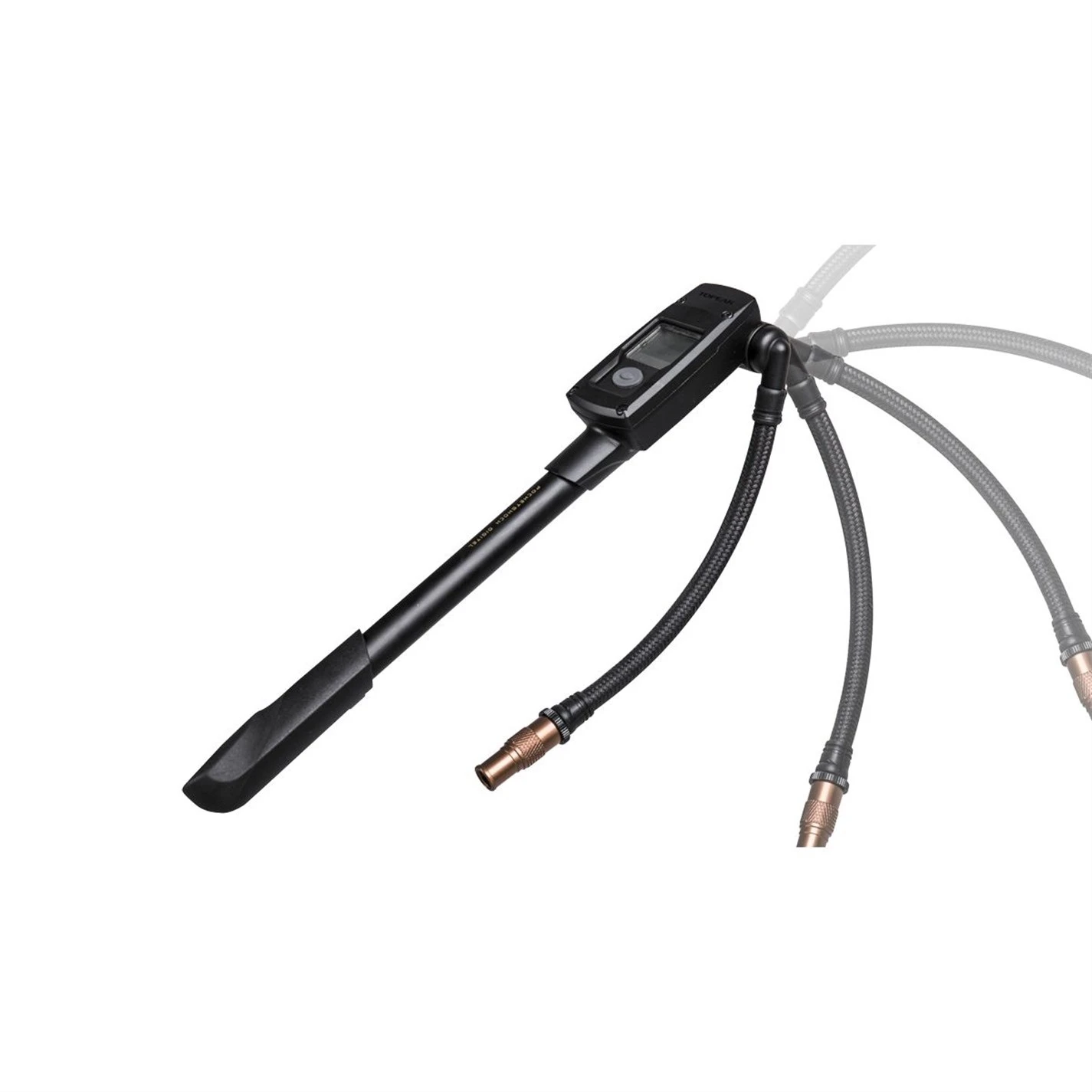 > Pressure-Rite valve > Aluminium barrel > 300 psi / 20.7 bar digital gauge > Air bleed button for precise pressure setting > Dual density polymer handle > Flexible rotating hose > 1x CR2032 Battery (included) > 25.8×4.5x3cm