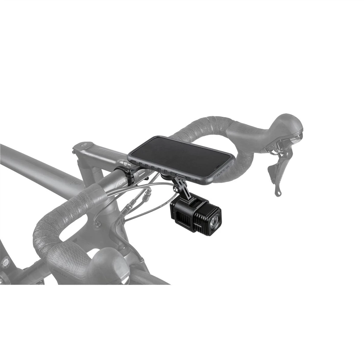 Sleek handlebar mount aligns devices centrally for viewing convenience.